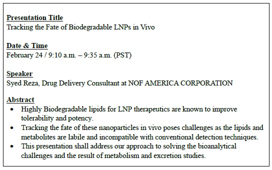 Additionally, Syed Reza, Drug Delivery Consultant at NOF AMERICA CORPORATION (a subsidiary of NOF CORPORATION), will make a presentation on February 24.